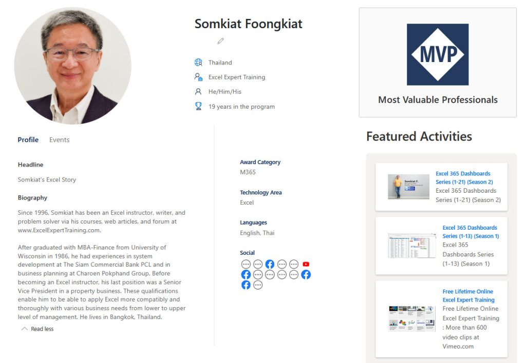 - เป็นผู้สร้างเว็บ Excel Expert Training เผยแพร่ให้ความรู้ Excel ฟรีมานานตั้งแต่ปีพ.ศ. 2542